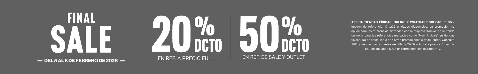 Cada prenda de Superdry cuenta una historia de artesanía y dedicación. Dada la naturaleza de este Final Sale, las unidades son limitadas y el inventario rota con velocidad. Asegura hoy tus favoritos con el respaldo de nuestra garantía de calidad y política de cambios. El tiempo corre, pero el estilo auténtico permanece. Haz que tu selección sea parte de tu legado personal antes de que el evento concluya el 8 de febrero del 2026.